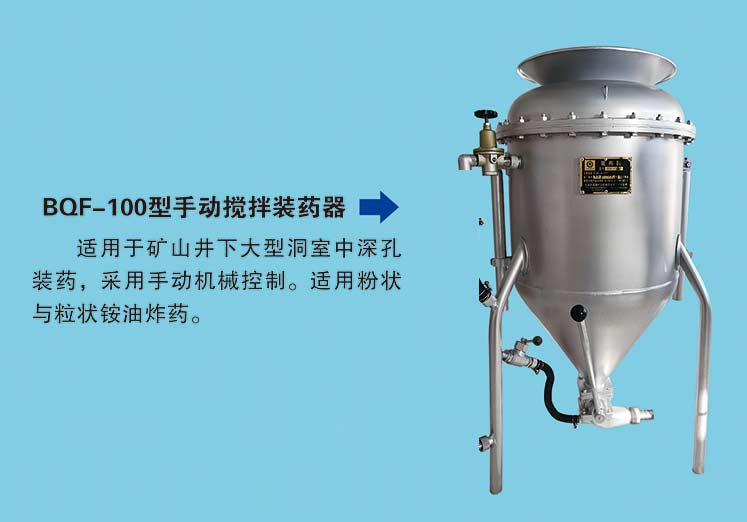BQF-100型抬杠式有攪拌裝藥器,適用于礦山井下大型洞室中深孔裝藥,采用手動機械控制。適用粉狀與粒狀銨* 油* 炸* 藥。